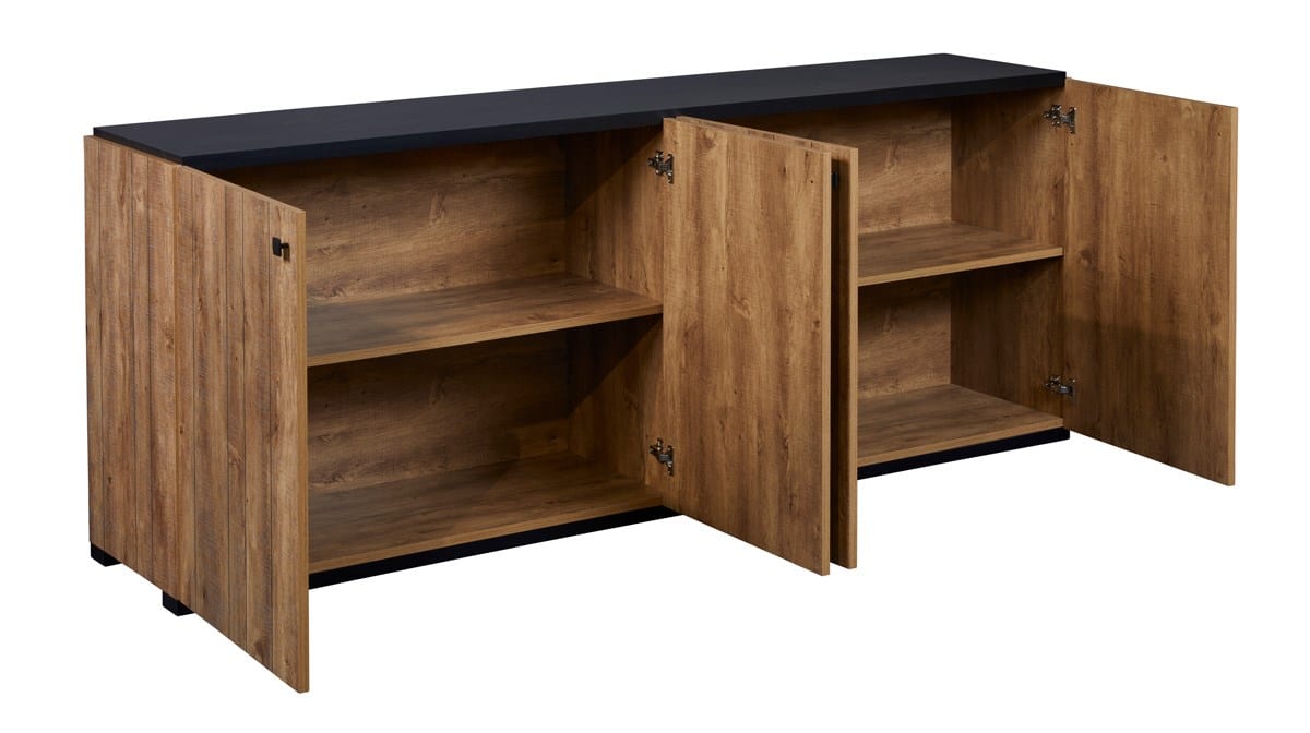 Ses 4 portes offrent un vaste espace de rangement, idéal pour organiser vaisselle, linge de table ou autres accessoires de salle à manger. La combinaison du décor bois naturel avec des détails noirs sur le plateau et les poignées apporte un contraste élégant et moderne.