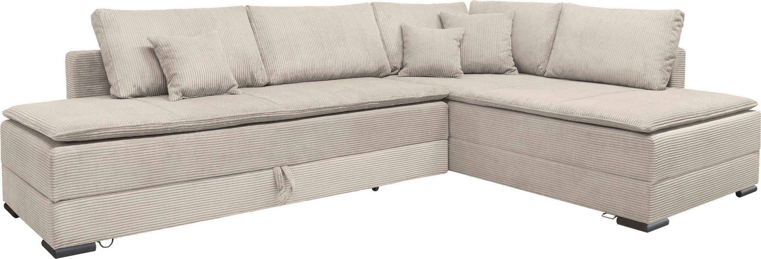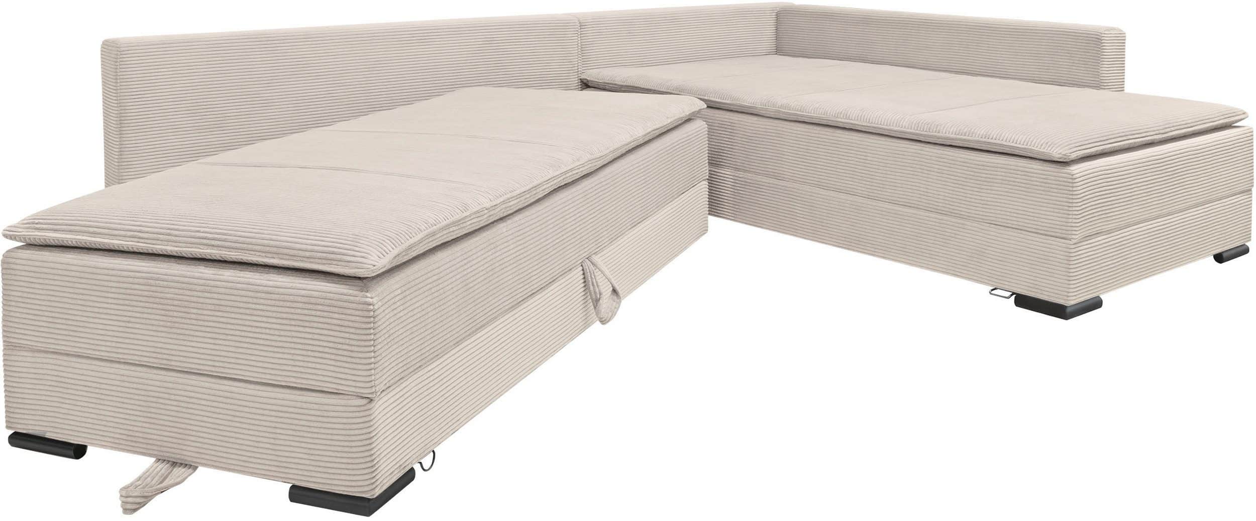 Cette double suspension rend l’assise et le couchage particulièrement confortables. Le surmatelas supplémentaire du canapé peut simplement être retourné et promet un sommeil réparateur. Les coffres de lit spacieux, dans lesquels peuvent être rangés toutes sortes de literie, rendent le confort parfait. Les pieds coudés au look chromé élégant complètent joliment le design bien pensé et tendance. Le canapé d’angle de haute qualité est disponible angle droite ainsi que les coussins décoratifs et de dossier amovibles.