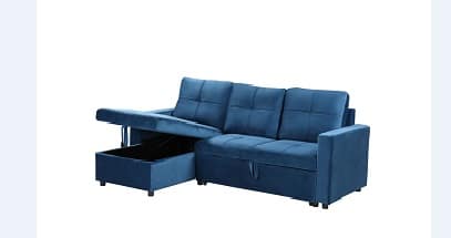 Canapé d'angle convertible pratique et confortable Coloris bleu. Le canapé TOLEDO est un magnifique canapé d angle, confortable, et ultra design. Il se compose de deux parties : d'un canapé 3 places sous lequel est placé le lit gigogne et d une méridienne contenant un grand espace de rangement. Pratique : Vous pouvez changer l'angle du canapé en déplaçant la méridienne à droite ou à gauche de l'assise principale.