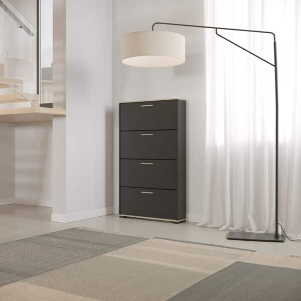 Avec son style intemporel et son faible encombrement, le meuble à chaussures izzy s'intégrera facilement dans toutes les pièces. Il offre un bel espace de rangement avec ses 4 portes abattantes. Existe en coloris banc et chêne kronberg. Disponible également avec 2 abattants et un tiroir,